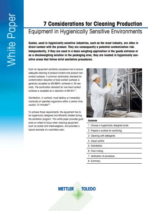 Effective and efficient cleaning starts with the right equipment. There are scales available on the market that have approval for hygienic design from the European Hygienic Engineering and Design Group (EHEDG) and the National Sanitation Foundation (NSF), but if such an approval is missing, consider the following points when selecting a scale for a hygienically sensitive environment: